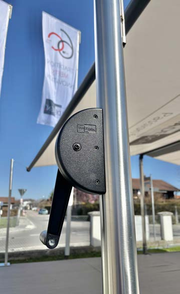 Durch einfaches lösen des Spannseils rollt sich das Segel selbständig aus und bleibt in jeder Position gespannt. Die Spannung des Segel erfolgt selbständig durch die Rotation der Seilkegel ohne Motor. Das Einrollen wird mittels einfachem und kraftschonendem Bedienseil durchgeführt, welches im Abschluss fixiert wird.